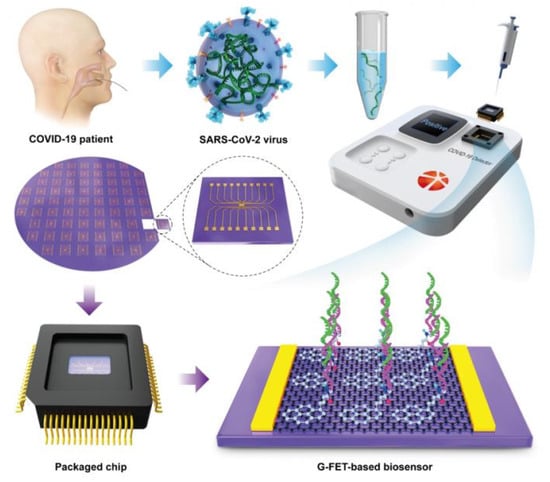 Nanomaterials have shown potential as transducers in the fabrication of FET biosensors. This is due to their excellent physical, optical, and electrochemical properties demonstrated in various biological applications [123,124]. The high mechanical strength, thermal stability, and outstanding conductivity of silicon- and carbon- (graphene and carbon nanotubes) based NPs are ideal for FET biosensors. Generally, the biorecognition molecules are immobilized on the surface of the NPs to capture disease-associated analytes. Binding of the analyte to the NP-conjugate generates an electrical potential that can be measured by a voltmeter [125]. The FET biosensors have the ability to detect the presence of an analyte at the PoC in a label free environment. The graphene-based FET biosensor, demonstrated in Figure 6, was used to measure antibodies against the SARS-CoV-2 S protein. The graphene oxide nanosheets increased the selectivity and sensitivity of the assay in various test samples, such as antigen protein, cultured virus, and nasopharyngeal swab specimens from COVID-19 patients. The biosensor detected SARS-CoV-2 in the culture medium and nasopharyngeal swab specimens, with a LOD of 16 pfu/mL and 242 copies/mL, respectively [90].