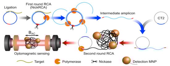 Homogeneous circle-to-circle amplification and optomagnetic biosensor. In the first round of rolling circle amplification (RCA), polymerases act tandemly to generate intermediate amplicons, which then anneal to the second round RCA, generating amplicon coils that lead to the assembly of MNPs. After a ligation step, all processes of amplification, hybridization, and detection take place simultaneously on an optomagnetic sensing-chip [92].