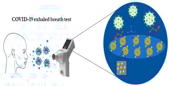 A multiplex nano-based sensor array for the detection of COVID-19-specific biomarkers from exhaled breath was developed and used for rapid and accurate diagnosis of COVID-19 (Figure 8). The developed sensor was composed of different AuNPs linked to organic ligands, creating a diverse sensing layer. As the breath passes through the array, a mixture of COVID-19-related volatile organic compounds (VOCs) react with the sensors and emit a set of electrical resistance signals as a function of time. The sensor showed 94% versus 76% accuracy in differentiating COVID-19 patients from controls, and 90% versus 95% accuracy in differentiating between patients with COVID-19 and patients with other lung infections [133].