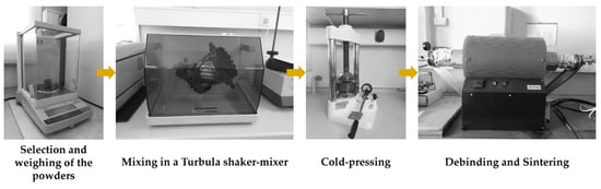 - Cold-pressing of the whole mixture. The mixture was uniaxially cold-pressed at 230 MPa in a metallic mold to produce green compacts (31 mm × 12 mm × 9 mm).