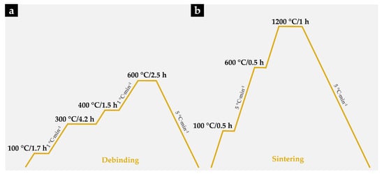 Figure 2. Debinding and sintering thermal cycles applied to Fe–WC compacts. (a) The thermal cycle carried out during debinding; (b) The applied thermal cycle with heating and cooling rates of 5 °C∙min−1. - Sintering the brown compacts. After the debinding, the compacts were sintered at 1200 °C for one hour in a horizontal resistance furnace equipped with a high-vacuum turbo molecular pump (≤5 × 10−3 Pa). The applied thermal cycle with heating and cooling rates of 5 °C∙min−1 is depicted in Figure 2b.