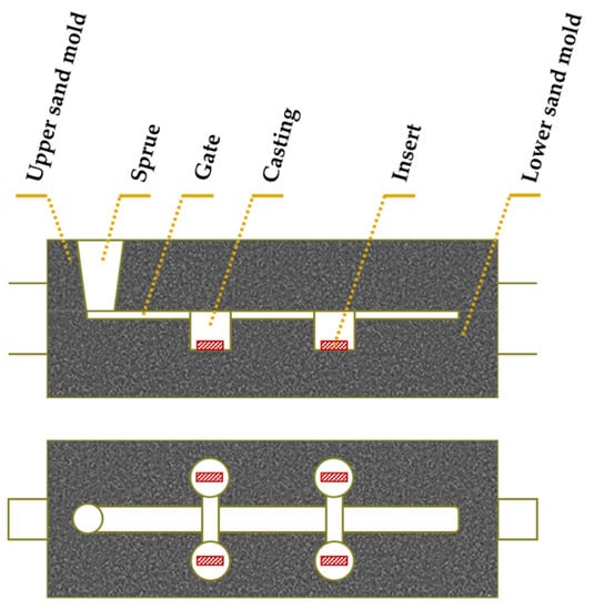 - Placement of porous sintered Fe–WC inserts in the mold cavity. Before casting the liquid metal, the inserts were positioned in the desired location of the mold cavity (see Figure 3).