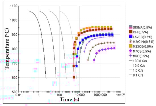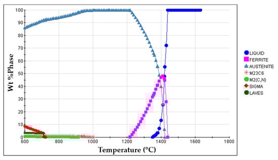 - Solution heat treatment. The solution heat treatment is a required step to dissolve brittle and Cr-rich phases that may form during the cooling of the steel [1,36,37]. These phases are sigma (σ), Laves, M2N, M2C, and M23C6, predicted from the equilibrium phase diagram calculated with JMatProTM v.11.2 and shown in Figure 4. From the continuous cooling transformation diagram (CCT), also calculated with JMatProTM v.11.2, a fast-cooling rate (approximately 1.0 °C∙s−1) is required to prevent the precipitation of secondary phases during the cooling stage (see Figure 5). Thus, the cast specimens were solubilized at 1075 °C for two hours and quenched in water. This solution heat treatment allowed a detailed analysis of the microstructure in the reinforced zone when subjected to a standard heat treatment cycle applied to austenitic stainless steel.
