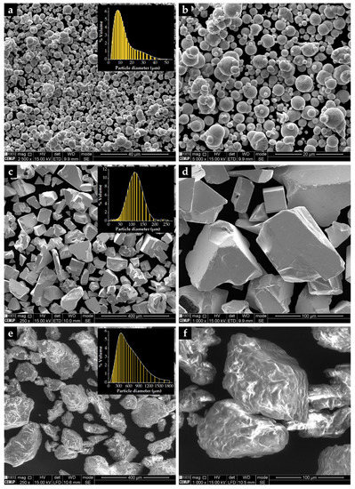 The characterization of the starting powders was the first step taken to evaluate the morphology and size distribution. The Fe powders are almost round, with an average diameter of 10 µm and a D50 of 8 µm (Figure 6a,b), unlike the WC powders that show a polyhedral shape (Figure 6c,d). These particles exhibit an average size of 106 µm and a D50 of 107 µm. The shape of M0101 binder powders is irregular, showing elongated and round particles (Figure 6e,f) with an average size of 475 µm and a D50 of 398 µm.