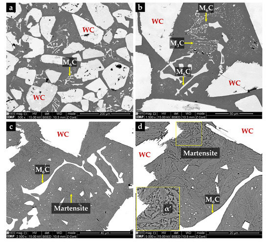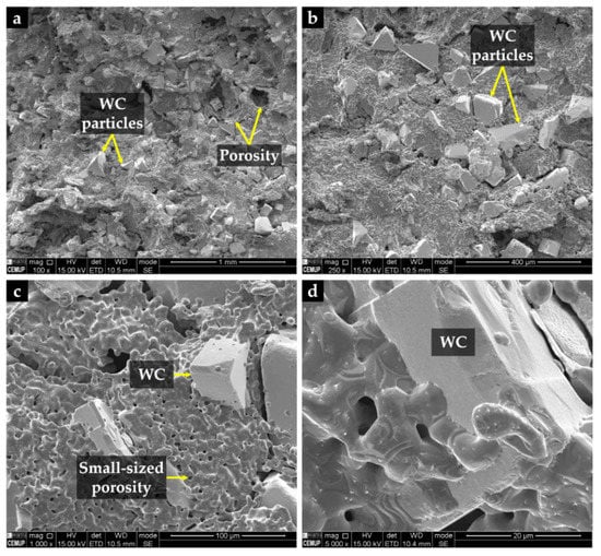 It can be seen from Figure 7 that WC particles are well distributed in the Fe matrix, and Figure 7d highlights the suitable wettability of WC particles by the iron. As expected, cavities left by the binder removed during the debinding process were found, and a random distribution of larger (≥100 µm) and smaller porosities (≤10 µm) was observed.