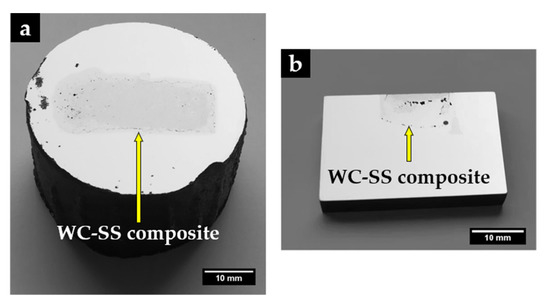 The production of WC-reinforced cast steel components has been studied since the first decade of the century. The majority of the studies have been focused on pressure-driven infiltration processing [27,28] and lost model technique [29,30,31]. There are also investigations concerning pressureless infiltration [32] and centrifugal casting processing [33,34]. However, to our best knowledge, this is the first study focused on the production of austenitic stainless steel parts locally reinforced with WC particles by pressureless infiltration.