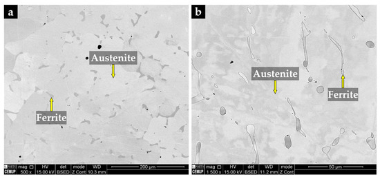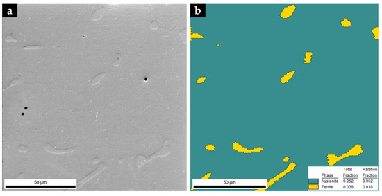The XRD pattern of the base metal presented in Figure 9 indicates the presence of austenite (γ). Nevertheless, SEM images of Figure 10 show pools of ferrite that were identified by indexed Kikuchi patterns and EBSD phase maps presented in Figure 11 and Figure 12, respectively. From the EBSD phase map of Figure 12b, we estimated a percentage of 4% of ferrite.