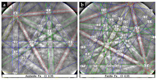 Indexed EBSD patterns corresponding to the phases that compose the microstructure of the austenitic stainless steel: austenite (a) and ferrite (b).
