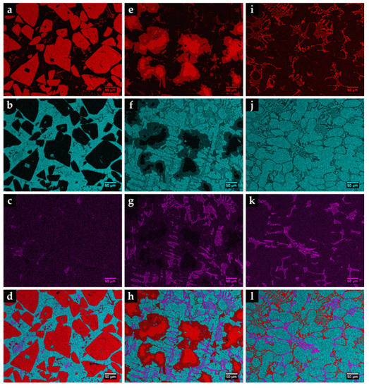 EDS elemental mapping of Fe (blue), Cr (pink), and W (red) for the microstructure of the three composite zones: CZ1 (a–d), CZ2 (e–h), and CZ3 (i–l).