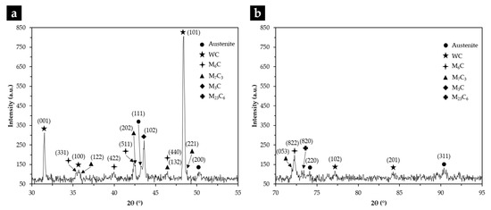 XRD patterns of the composite zone in the 2θ range of 30–55° (a), and 70–95° (b).