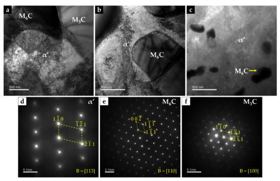 Dark-field TEM image of CZ1 composite zone: (a) interface between (Fe,W,Cr)6C, (Fe,W,Cr)3C, and α’, (b) (Fe,W,Cr)6C with a quasi-cuboid shape precipitated within α’ matrix, and (c) fine precipitates of (Fe,W,Cr)6C. SAED patterns were achieved by using the (d) [113] zone axis for α’, (e) [110] zone axis for (Fe,W,Cr)6C, and (f) [100] zone axis for (Fe,W,Cr)3C.