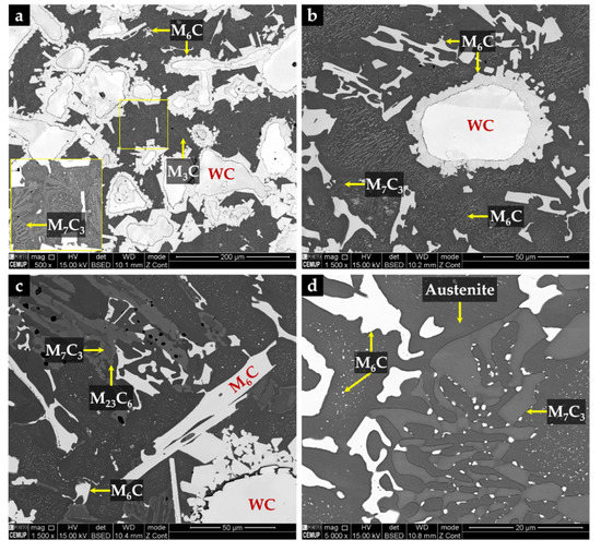 The microstructure of the CZ2 zone shown in Figure 18 indicates that a strong dissolution of WC particles occurred with a consequent local enrichment of the matrix in C and W that, in turn, promoted the precipitation of (Fe,W,Cr)6C during slow cooling. Figure 18a–c show the precipitation of (Fe,W,Cr)6C around WC particles with an irregular form. The (Fe,W,Cr)3C were also detected in the CZ2 zone. Figure 19 provides the indexed Kikuchi patterns of the carbides formed in the CZ2 zone: (Fe,W,Cr)6C, (Fe,W,Cr)3C, (Fe,Cr,W)7C3, and (Fe,Cr,W)23C6. The (Fe,Cr,W)7C3 and (Fe,Cr,W)23C6 carbides were also identified from the XRD results, present in Figure 15. In Figure 18c, it is possible to observe carbides with a core–shell structure with a core of (Fe,Cr,W)7C3 and a shell of (Fe,Cr,W)23C6, suggesting the transformation of (Fe,Cr,W)7C3 into (Fe,Cr,W)23C6. A similar transformation was found in a cast austenitic stainless steel when exposed to the in-service temperature of 750–1000 °C [46].