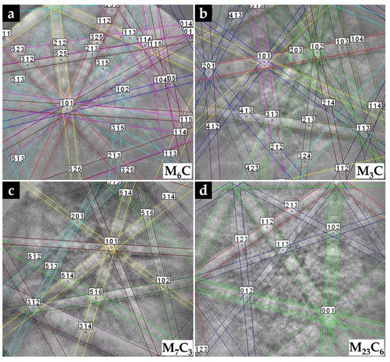 Indexed EBSD patterns of the carbides in CZ2 composite zone: (Fe,W,Cr)6C (a), (Fe,W,Cr)3C (b), (Fe,Cr,W)7C3 (c), and (Fe,Cr,W)23C6 (d).