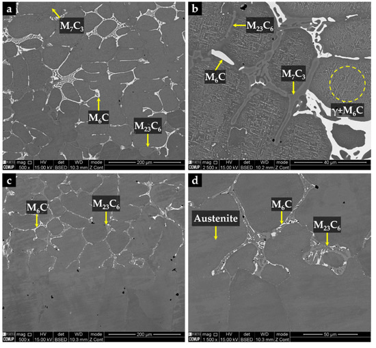 SEM-BSE images of the microstructure of CZ3 composite zone: (a) multi-phase interdendritic network of (Fe,Cr,W)7C3, (Fe,Cr,W)23C6, and (Fe,W,Cr)6C, (b) higher magnification of (a) showing fine precipitation of (Fe,W,Cr)6C inside the γ matrix, (c) bonding interface free of discontinuities, and (d) higher magnification of (c) showing the interdendritic precipitation at the bonding interface.