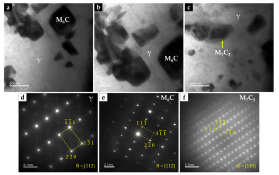 Bright-field TEM image of the CZ3 composite zone: (a) (Fe,W,Cr)6C with a cuboid shape precipitated within γ matrix, (b) higher magnification of (a), showing an agglomerate of (Fe,W,Cr)6C carbides, and (c) (Fe,Cr,W)7C3 precipitated within γ matrix. SAED patterns were achieved by using the (d) [112] zone axis for γ, (e) [112] zone axis for (Fe,W,Cr)6C, and (f) [110] zone axis for (Fe,Cr,W)7C3.