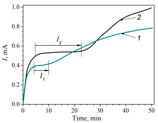 Current of anodic dissolution vs. time curves on the surfaces of the MCS (1) and the MHCS (2) in 1% NaCl solution with CH3COOH (pH = 3.1), bubbled with CO2, under anodic potential Ea = −0.1 V.