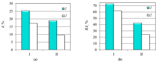 Elongation δ (a) and reduction in area RA (b) of the MCS (I) and the MHCS (II) determined by tensile testing: 1—without hydrogenation; 2—after electrolytic hydrogenation.