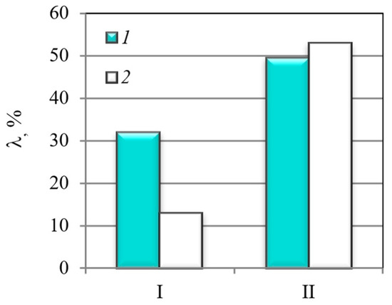 Relative changes in plasticity characteristics of the MCS (I) and the MHCS (II) caused by electrolytic hydrogenation: 1—λδ; 2—λRA.