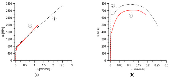 The stress–strain graphical relationships for the MHCS (1) and MCS (2) casing pipes: (a)—full true relationships; (b)—nominal curves.