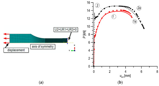 (a)—the FEM model of the tensile specimen; (b)—comparison of experimental (lines—1, 2) and numerically calculated (points—1a, 2a) curves of load–displacement of tensile specimens for the MHCS (1, 1a) and MCS (2, 2a).