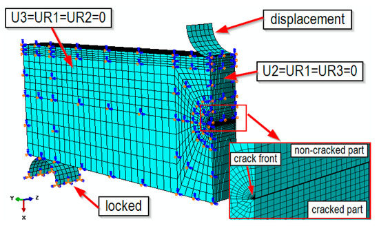 In the next stage, a numerical simulation of the load on the three-point bending specimens with a one-sided notch, SENB, was carried out. Figure 10 shows the numerical model of the analyzed specimen and the boundary conditions imposed on the model. The numerical modeled specimen was loaded by the preset roller displacement. The stress and strain fields were analyzed for specimens under applied loading, when the measurement point displacement at the loading roll was equal to 1.2 mm.