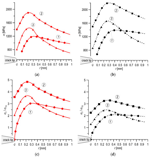 The graphs of stress distribution before the crack tip: of nominal value for the MHCS (a) and MCS (b) and of normalized by σYS for the MHCS (c) and MCS (d), where: 1—σ11; 2—σ22; 3—σ33.