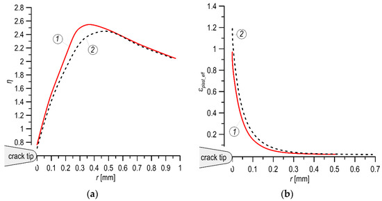 Similar tendencies in the distributions of the STF were observed for the studied steels (Figure 12). Thus, for the MHCS, the distribution reaches higher values, and the maximum value is closer to the crack tip (Figure 12a) than that for the other steel. For the MHCS, the level of effective plastic deformation immediately before the crack tip is lower than that in the MCS (Figure 12b, Table 4), which is also a feature of the material’s lower fracture toughness.