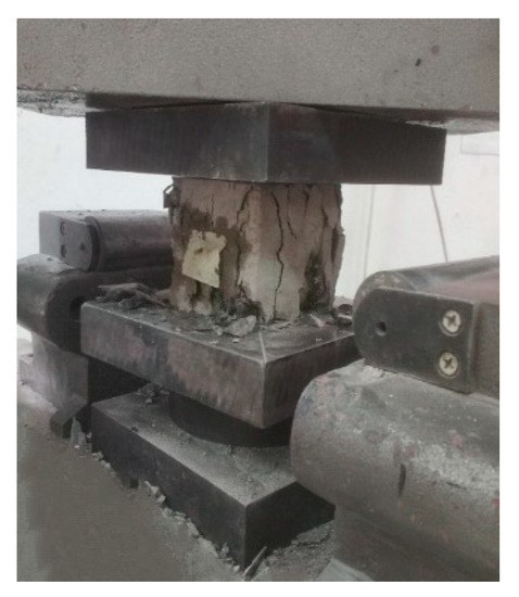 Cubic specimens with the dimensions of 100 × 100 × 100 mm3 were used to test the strength of the concrete. Three cubic specimens were used for each group, and the total number for each test was 51. The compressive strength and the splitting tensile strength tests were performed using a universal testing machine in accordance with the GB/T 50081-2002 standard [20], as shown in Figure 1 and Figure 2.