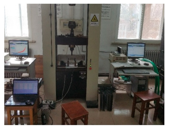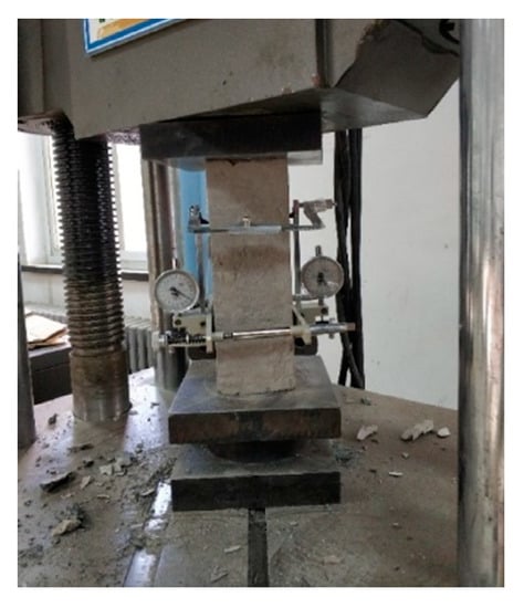 Prism specimens with the dimensions of 100 × 100 × 300 mm3 were used for the elastic modulus test, which was performed on a universal testing machine in accordance with the GB/T 50081-2002 standard [20], as shown in Figure 3 and Figure 4.