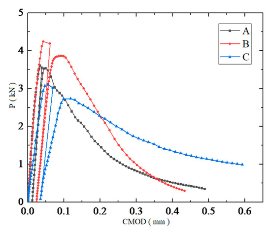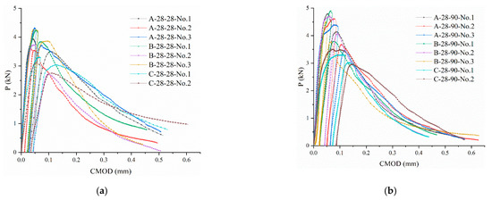 The test results were labeled according to the following rules: The first letter represented the curing condition, with A representing steam curing, B representing standard curing, and C representing natural curing; the second number represented the loading age; and the third number denoted the age of the test. For example, A-28-90 represented the test results of the steam-cured concrete loaded at the 28th day and tested at the 90th days. Each group consisted of three beams, and P-CMOD curves were drawn, as shown in Figure 11.