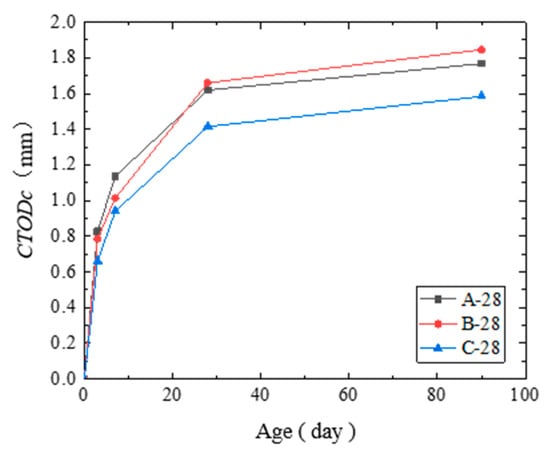 (2) The critical crack tip opening displacements of the concrete under the three curing conditions are shown in Table 9 and Figure 16. The results showed that the increased as the age increased. A sharp increase in the mainly occurred before the 3rd day, and development was stable after 3 days.