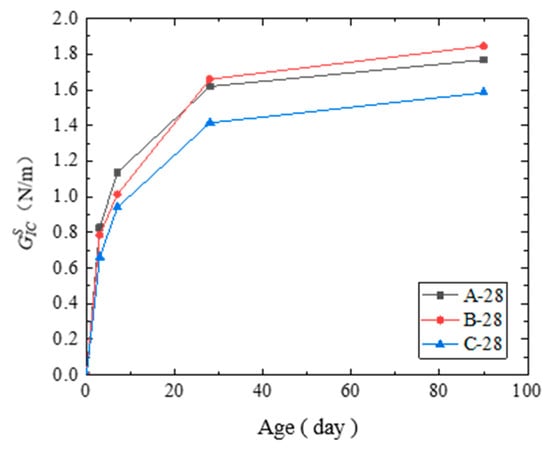 The results showed that the steam curing significantly increased the growth rate of . On and before the 7th day, the of the steam-cured concrete was the largest. From the 28th day and onwards, the of the standard-cured concrete was the largest. From the 28th day, of all the cured concrete developed similarly. The development of the of the cured concrete indicated that the standard curing condition could improve crack propagation resistance better than steam curing.