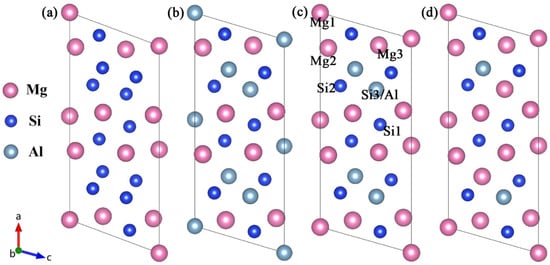 For the β″ phases, the formation enthalpies and lattice parameters of Mg4Al3Si4, Mg5Al2Si4, Mg6AlSi4, and Mg5Si6 were computed for each of the models of the crystal structures available in the literature [17,18,21], allowing a critical assessment of the validity of the models. Figure 1 shows four atomic models of the β″ without Cu. The Wyckoff site information of the energetically most favorable β″-Mg5Al2Si4 is shown in Table 1 [18,19].