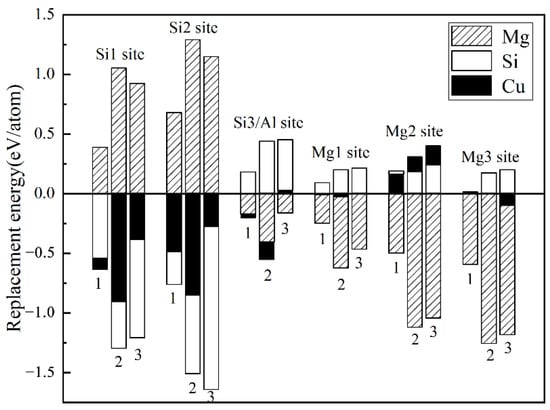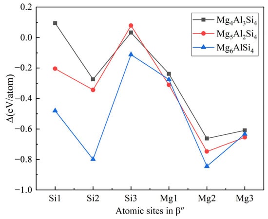 The replacement energy is shown in Figure 2 and alternative solute atoms Mg/Si were incorporated for comparison with Cu at different sites. In order to more intuitively express the competitive occupation sites of Cu atoms, the variable Δ is introduced and the Δ values of Cu atoms at different sites in different β″ configurations are shown in Figure 3. The Δ represents the “competitiveness” between Cu atoms and other solute atoms at each site, it is the difference between the lowest replacement energy of Mg/Si solute atoms and the replacement energy of Cu atoms. The larger the value of Δ, the more likely the Cu atom will occupy the site. Consequently, due to the low Cu occupancy in β″, only three designated Cu sites (Si1, Si3, Mg1, see Figure 1c) were allowed to host Cu atoms according to the relative value of replacement energy (refer to Figure 2). This conclusion is consistent with previous research [38].