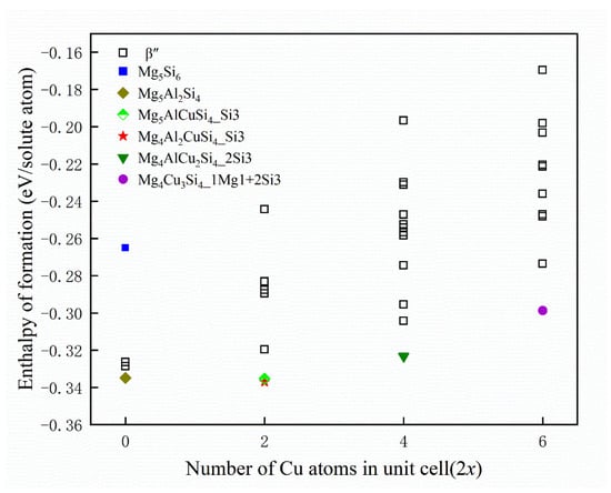 Finally, in order to compare the structures with different Al content, the formation enthalpy can also be expressed in kJ/mol of solute atoms, instead of kJ/mol [52]. This transformation is achieved as follows: ΔHSS [kJ/mol solute] = ΔHSS [kJ/mol]/(xMg + xSi + xCu), where xMg and xSi and xCu are the atomic fractions of Mg and Si and Cu in the β″ phases MgaAlbCucSid (a = xMg, b = xAl, c = xCu, d = xSi). This is a common definition of formation enthalpy in the literature [9,21,52].