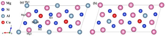The well-defined Mg4+xAl2−xCuSi4 (x = 0, 1) unit cell that sole minimization of the β″ phase formation enthalpy supports. (a) Mg4Al2CuSi4; (b) Mg5AlCuSi4. The relative location of each site is marked in (a).