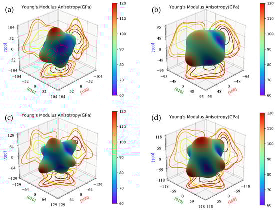 Here, we compare the mechanical properties of β″ with or without Cu atoms. The elastic constants of key β″ phases that are most likely to precipitate during aging were calculated by using fully relaxed crystal structures, and the results are listed in Table 4. According to the Born stability criterion [61], the elastic constants of Mg4Al2CuSi4 and Mg5AlCuSi4 all meet the stability criteria of monoclinic crystals. This further supports the stability of Mg4+xAl2−xCuSi4 (x = 0, 1) obtained from the formation enthalpy. The elastic constants C11, C22, and C33 are much greater than the other elastic constants in all calculated β″ phases, resulting in an obvious elastic anisotropy. In order to understand the anisotropic characteristics of these precipitation phases, the Young’s modulus anisotropies are evaluated by three-dimensional map as shown in Figure 6. Comparing Figure 6a and c, it can be seen that after Cu atoms substituted Al atoms on the Si3/Al sites, the Young’s modulus (E) anisotropy increases significantly; similar results are also shown in Figure 6b,d. This phenomenon indicates that the growth rate of the Cu-containing β″ phases may be faster than that of the β″ without Cu. It is consistent with the previous study that Cu can accelerates the age-hardening response [14,28,30].