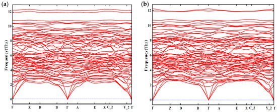 In addition, the dynamic stability is also taken into account. The phonon spectra of Mg4Al2CuSi4 and Mg5AlCuSi4 are shown in Figure 7. From Figure 7, one can see that there is no virtual frequency of configuration Mg4Al2CuSi4 and Mg5AlCuSi4, which is generally considered to be dynamically stable.