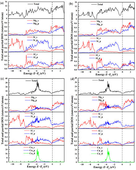 The total and partial electronic density of states (PDOSs and TDOSs) for four β″ type compounds. (a) Mg4Al3Si4; (b) Mg5Al2Si4; (c) Mg4Al2CuSi4; (d) Mg5AlCuSi4.