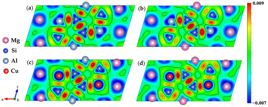 Charge density difference of four calculated β″ phases. (a) Mg4Al3Si4; (b) Mg5Al2Si4; (c) Mg4Al2CuSi4; (d) Mg5AlCuSi4.