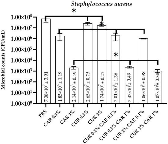 Figure 2. The effect of PBS-based neat and modified films on the viability of Staphylococcus aureus cells; one-way ANOVA: *—p > 0.05.