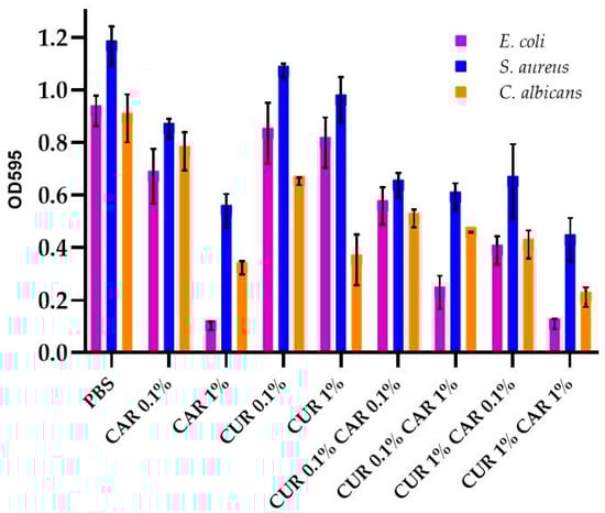 Figure 4 shows the effect of neat PBS film and modified films on single-species microbial biofilm formation. The addition of CAR to the PBS films resulted in a significant reduction in biofilm formation on the surface of the material (p < 0.05), which agrees with literature reports on the effect of CAR on the viability and formation of biofilms, including multispecies microbial communities [18]. Further, the addition of CUR resulted in a decrease in biofilm to a lesser extent than CAR, but the decrease was still statistically significant (p < 0.05). CUR has been shown to affect biofilm formation by affecting quorum-sensing when it is released from the polymer matrix [44,53]. The synergistic effect of CUR and CAR additives on biofilm formation is clearly dependent on the concentration of additives used for each of the three microorganism strains used. Films containing CUR 1%CAR1% showed the best inhibition of biofilm formation on the surface of the films, which gives reason to suspect that these additives act synergistically to complement each other, and to obstruct the adhesion of microorganisms to the surface of the material or communication between microbial cells.