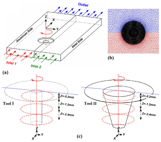The friction stir welding (FSW) process belongs to the group of solid-state joining processes—it enables to provide the appropriate amount of welding activation energy in the form of heat without exceeding the melting point of base materials (unlike fusion processes: arc, plasma, laser and electron beam welding) [1]. This is advantageous because it limits structural transformations and joint properties changes resulting from the crystallization process [2,3]. Compared to traditional joining processes, FSW offers the possibility of making high-strength and low-defect joints, is greener, in many cases cheaper, energy saving and more flexible because there is no need to use consumables and the process can be easily automated [4]. The main limitation of the process is the necessity to select and manufacture a tool of an appropriate shape and made of a material with a higher hardness than the base material. In addition, the elements to be joined must be appropriately fastened [5]. Due to these features, the development of FSW follows the directions of research of various variants of the process limiting individual constraints and developing each of the necessary process conditions: welding machine, tool, the workpiece, process flow, etc. [6,7,8]. Extremely attractive from the point of view of FSW industrial applications is the possibility of using the characteristic properties of various engineering materials by making dissimilar joints, especially from materials that are difficult to weld by conventional fusion welding processes [9,10,11]. For this purpose, it is necessary to overcome technological difficulties caused by significant differences between the materials to be joined in terms of structure, atomic bonds and physico-chemical properties (e.g., melting points, mechanical properties, coefficients of conductivity and thermal expansion) [12,13,14]. A particularly serious problem when joining metals is the formation of intermetallic compounds [15,16] that reduce the plastic properties of joints. Large differences in the properties of aluminum and ferrous alloys make the weldability window extremely limited [17,18]. Despite the simplicity of this process, understanding thermo-mechanical phenomena during welding is complicated. The joint formation mechanisms are based on the formation of a “third body region”: an area heated to the range between recrystallization temperature and melting point of material and characterized by relatively high viscosity and low flow stress [19,20]. Trial and error tests or intelligence systems to optimize final product properties are time-consuming and costly. To overcome these problems, simulation analysis has frequently been used since the 2000s for the FSW process [21,22]. Limited research has reported simulations of dissimilar FSW joints. Among various simulation methods, the computational fluid dynamic (CFD) technique shows significant potential for high accuracy results in the simulation of FSW dissimilar joints [23,24,25]. Besides reported results by various researchers, limited authors considered CFD modeling of the dissimilar joint [26,27]. Difficulty and complexity of equation and boundary conditions, especially at base metal interfaces, caused the simulation of dissimilar joints to be an exciting topic for industries and researchers [28,29,30].