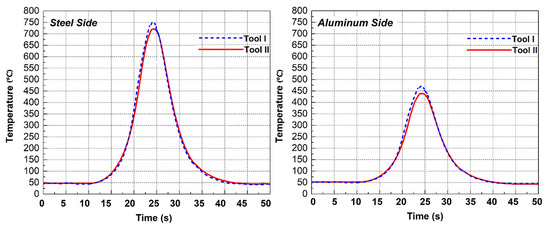 For this reason, the total generated heat in the aluminum and steel sides with Tool II was lower than for the Tool I, which caused the total generated heat by Tool II to be lower. The comparison between experimental results and simulation data showed that the maximum 4% differences were recorded. The maximum recorded by thermocouples was on the steel side for both tools. The maximum recorded temperature for Tool I and Tool II were 772 °C and 761 °C, respectively, while the maximum temperature during the simulation procedure was 738 °C and 725 °C, respectively.