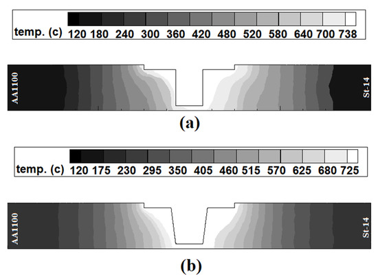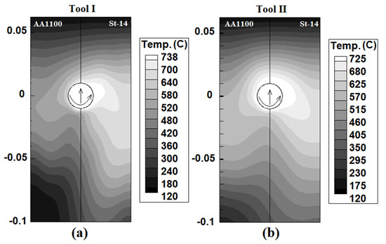 Results of simulation of internal heat distribution in joints made using (a) Tool I and (b) Tool II.