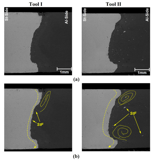 Due to obtained results, the stirring flow in the joint welded with Tool II is more intense than in the joint that was welded by Tool I (Figure 5b). The swirl flow pattern is detectable in the upper area of the Tool I joint, but this materials flow type is also formed in the up and down area of the joint welded by Tool II. On the other hand, more steel fragments (StF) spread in an aluminum matrix of joints welded by Tool II. The bigger SZ in the joint that was FSWed by Tool II shows that the aluminum matrix’s diffused length of steel fragments was also more. Due to the results, it can be concluded that the mechanical working in the stir zone of the joint that Tool II welded was more intense than for Tool I. For this reason, the bigger stir zone (heated area) was formed in simulation results for Tool II.