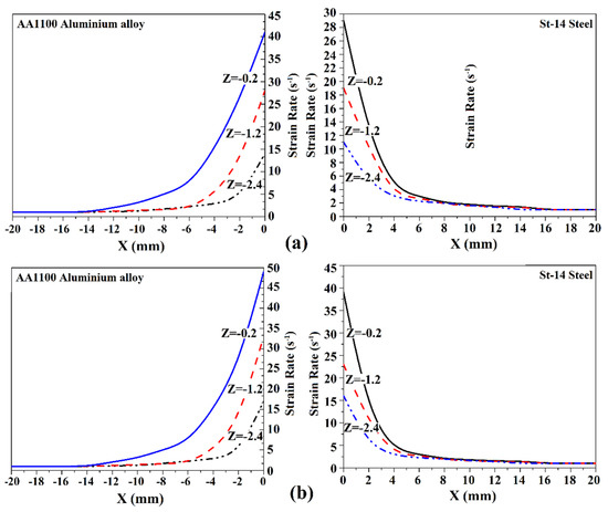 The static analysis of computed strain rate for Tool I and Tool II pins are presented in Figure 7a,b, respectively. The results were collected from different plans of the pin presented in Figure 2c. The overall survey indicated that the strain rate on the aluminum side was higher than on the steel side in both samples. It seems that the lower strength of AA1100 caused this part to became softer during the FSW process, and stirring action on softer material increased the strain rate. With increasing distance from the shoulder, the strain rate in both materials decreased. This trend shows that at lower areas of the stir zone, stirring action decreases [72,73,74].