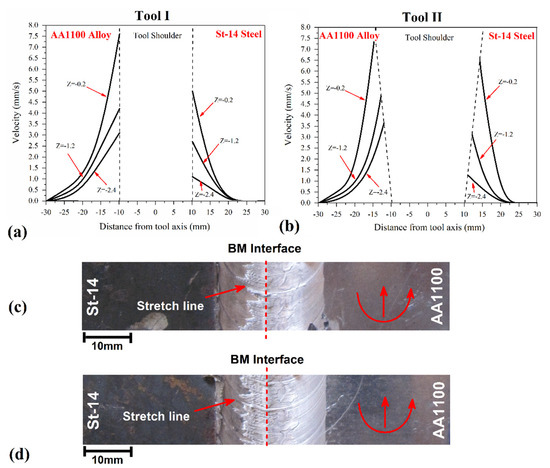 The materials velocity around the tool shoulder determines surface materials mixing [33,75,76]. The surface flow of joints welded by Tool I and Tool II are depicted in Figure 8c,d, respectively. The joint lines formed uniformly, and surface flow rings can be detected in both cases. The main point on the surface of the joint line is the stretching of aluminum alloy into the steel side. The results show that the higher strain rate and materials’ velocity in the Tool II case, which caused more aluminum alloy to stretch into the steel side. This mixing pattern helps to improve the properties of the final weld.