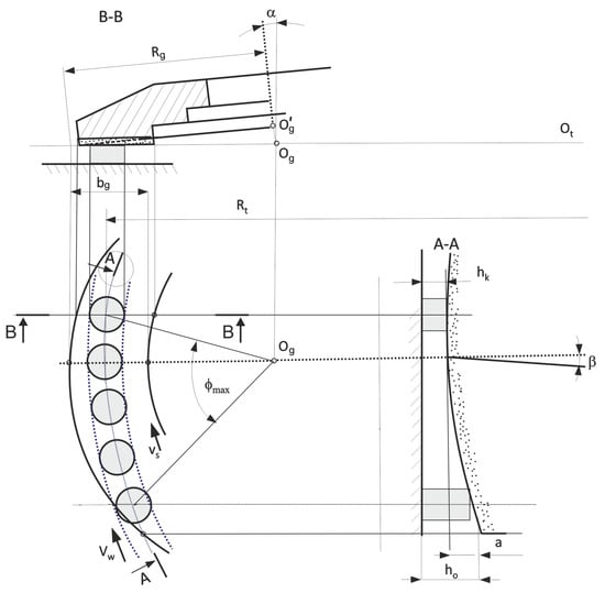 Grinding wheels with the designation W1–W4 worked in the technological system with the axis of the headstock inclined by the angle α and β and their active surfaces were in the form of a hyperboloid. The task of the W5 grinding wheel was to smooth the ground elements and it worked in a typical kinematic system of grinding with the grinding wheel face (α = 0), and its active surface was flat. The values of the α angles for the W1–W5 grinding wheels are presented in Table 4.