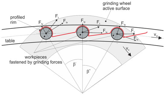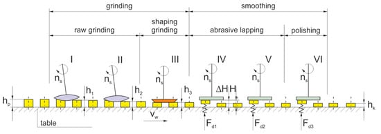 The height of the elements after the machining process (rotor) was hk = 0.8–0.01 mm. Due to the shape of the workpieces and a large allowance (0.72 mm), five resin-bonded diamond grinding wheels with a radius of Rg = 100 mm were used for machining (Figure 6, Table 2 and Table 3), mounted on the spindles located around the perimeter of the track of items.